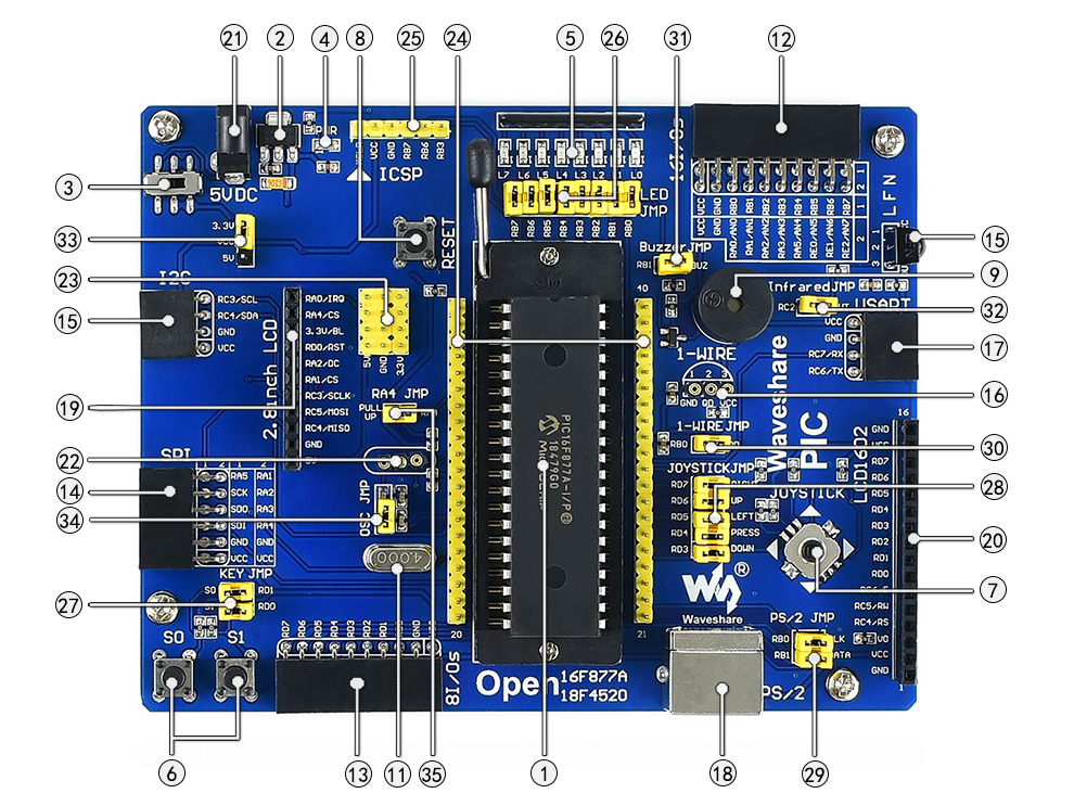 PIC开发板Open16F877A是一块以PIC16F877A为主控芯片的开发板,它带有丰富的扩展接口,支持各类外围模块的接入。
