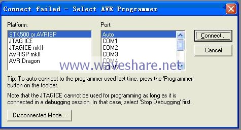 在左边,选择“STK500 or AVRISP”,在右边,选择“Auto”(或具体的COM口),点击“Connect”进行联机。
