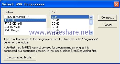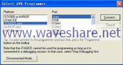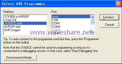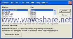 在左边,选择“JTAGICE mkII”,在右边,选择“Auto”(或具体的COM口),点击“Connect”进行联机。