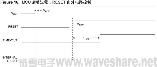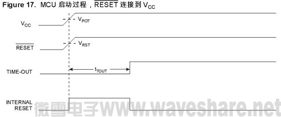 上电复位 (POR) 脉冲由片内检测电路产生。检测电平请参见 Table20。 无论何时 VCC 低于检测电平 POR 即发生。 POR 电路可以用来触发启动复位,或者用来检测电源故障。