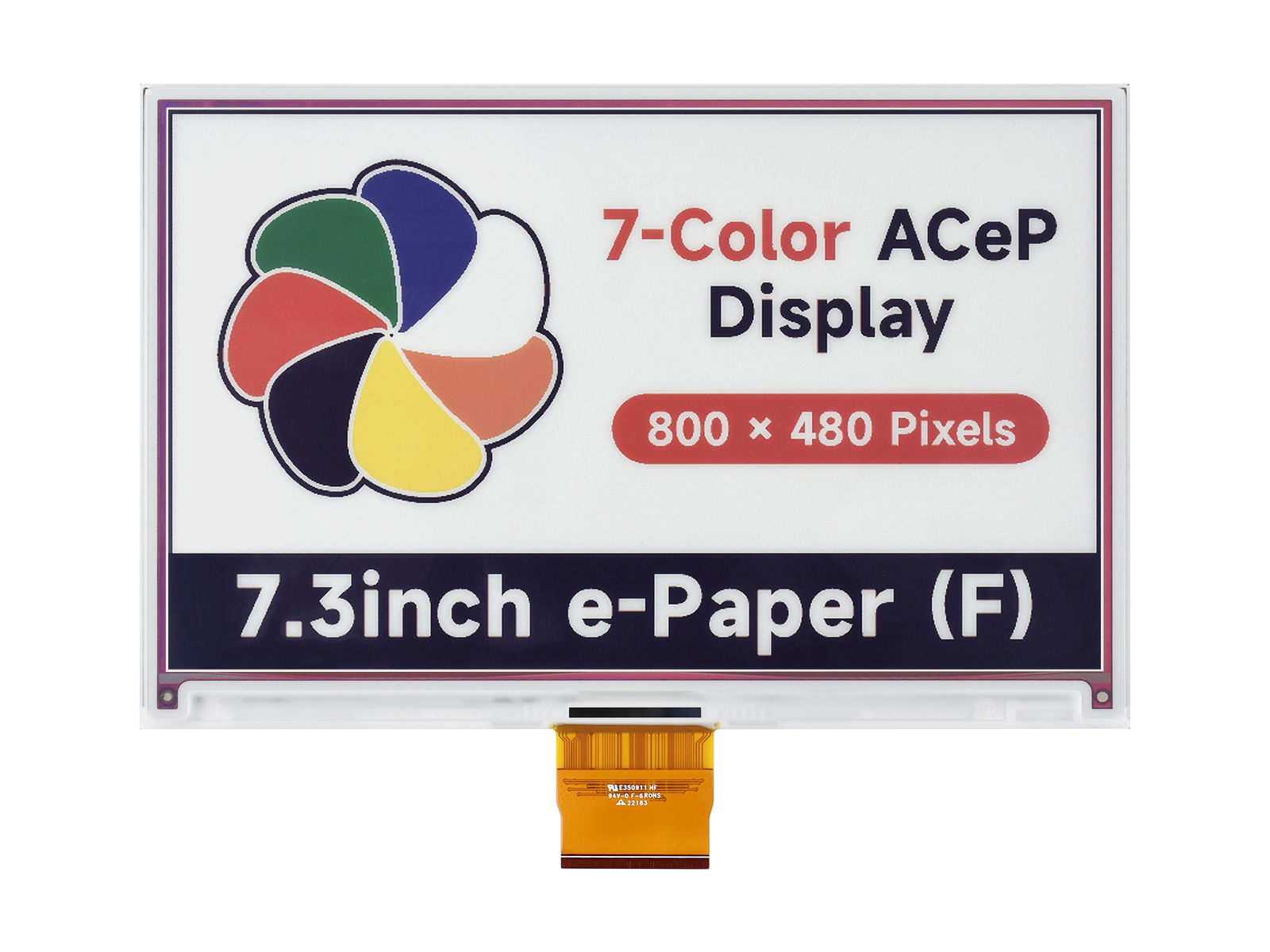 | 7.3inch e-Paper (F) | 7彩色 | 2 | 800×480 | 160.00 × 96.00 | 170.20 × 111.20 × 0.91 | 35 | - | - | SPI |