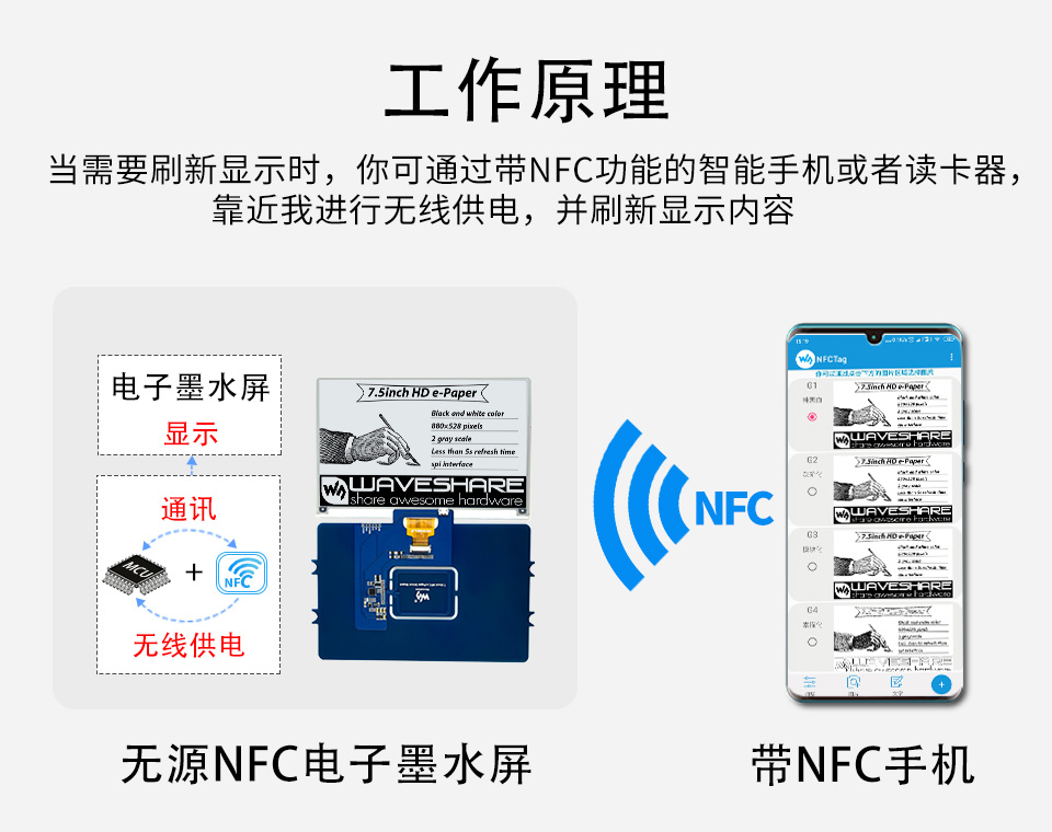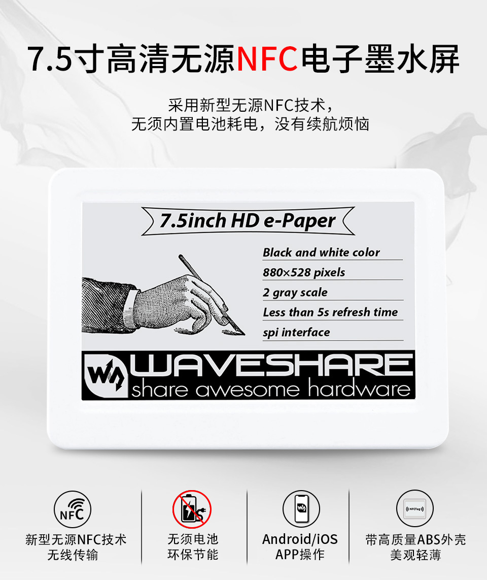 | 2.13inch NFC-Powered e-Paper | 黑、白 | 250 × 122 | 23.70 × 48.55 | 65.35 × 40.05 | 2s | √ | √ |