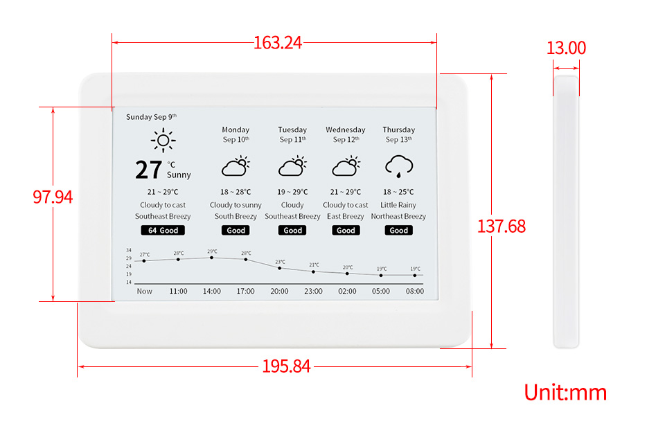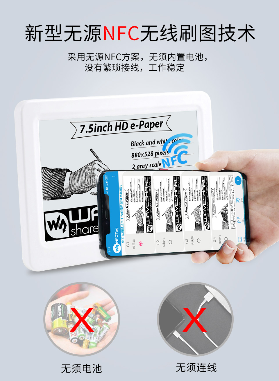 | 2.13inch NFC-Powered e-Paper (G) | 红、黄、黑、白 | 250 × 122 | 23.70 × 48.55 | 65.35 × 40.05 | 16s | √ | √ |