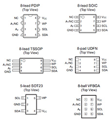 AT24C04C可选节省空间的8脚PDIP, 8脚TSSOP, 8脚JEDEC SOIC, 8脚UDFN, 5脚SOT23, 8触点VFBGA封装, 并通过2-wire串行接口存取。