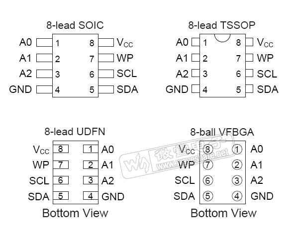 AT24C256C可选节省空间的8脚 JEDEC SOIC,8脚 TSSOP, 8脚 UDFN 和8脚 VFBGA封装,并通过2-wire串行接口存取。
