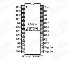 AD7824 概述The AD7824 and AD7828 are high-speed, multichannel, 8-bit ADCs with a choice of 4 (AD7824) or 8 (AD7828) multiplexed analog inputs. A half-flash conversion technique gives a fast conversion rate of 2.5 µs per channel and the parts have a built-in track/hold function capable of digitizing full-scale signals of 10 kHz (157 mV/µs slew rate) on all channels. The AD7824 and AD7828 operate from a single +5 V supply and have an analog input range of 0 V to +5 V, using an external +5 V reference. The AD7824 and AD7828 can be interfaced easily to most popular microprocessors. The AD7824 and AD7828 are fabricated in an advanced, all ion-implanted, Linear-Compatible CMOS process (LC²MOS) and have low power dissipation of 40 mW (typ). The AD7824 is available in a 0.3" wide, 24-pin "skinny" DIP, while the AD7828 is available in a 0.6" wide, 28-pin DIP and in 28- terminal surface mount packages. |