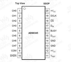 ADS8345 概述The ADS8345 is an 8-channel, 16-bit, sampling Analog-to-Digital (A/D) converter with a synchronous serial interface. Typical power dissipation is 8mW at a 100kHz throughput rate and a +5V supply. The ADS8345 includes a shutdown mode which reduces power dissipation to under 15µW. The ADS8345 is ensured down to 2.7V operation. Low-power, high-speed, and an onboard multiplexer make the ADS8345 ideal for battery-operated systems such as personal digital assistants, portable multi-channel data loggers, and measurement equipment. The serial interface also provides low-cost isolation for remote data acquisition. The ADS8345 is available in a QSOP-20 or SSOP-20 package and is ensured over the –40°C to +85°C temperature range. |