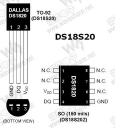 DS18S20 概述DS18S20数字温度计提供9位摄氏温度测量,具有非易失性、上下触发门限用户可编程的报警功能。DS18S20通过1-Wire总线与中央微处理器通信,仅需要单根数据线(和地线)。DS18S20具有-55℃至+125℃的工作温度范围,在-10℃至+85℃温度范围内精度为±0.5℃。另外,DS18S20能够直接由数据线获取电源(“寄生电源”),无需外部工作电源。 每片DS18S20具有唯一的64位序列码,这些码允许多片DS18S20在同一条1-Wire总线上工作,因而,可方便地使用单个微处理器控制分布在大范围内的多片DS18S20器件。从中受益的应用包括:HVAC环境控制、室内,设备或者机器内部的温度监测系统、过程监控和控制系统。 |