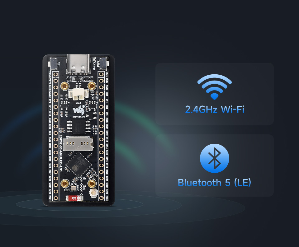 本产品采用 ESP32-S3R8 芯片,支持 2.4GHz Wi-Fi 和 BLE 5 蓝牙功能,集成大容量 Flash 和 PSRAM,板载 1.91 寸高清 AMOLED 显示屏,可流畅运行 LVGL 等 GUI 界面程序;还板载有 QMI8658 六轴传感器,Micro SD 卡槽和锂电池充电等外设资源,同时预留 Pico 兼容引脚接口,兼容性和扩展性强,可快速开发 ESP32-S3 的 HMI 等应用。