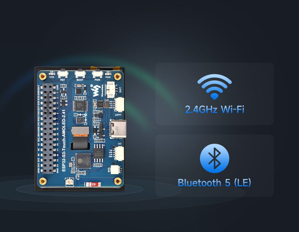 本产品采用 ESP32-S3R8 芯片,支持 2.4GHz Wi-Fi 和 BLE 5 蓝牙功能,内置大容量 Flash 和 PSRAM。配备 2.41 英寸高清 AMOLED 显示屏,可流畅运行 LVGL 等 GUI 程序。板载 RTC、IMU、Micro SD 卡槽及锂电池充电功能,外设资源丰富,同时预留 USB、UART、I2C 及 34PIN GPIO 接口,提供灵活扩展能力,是快速开发基于 ESP32-S3 的 HMI 应用的理想选择。