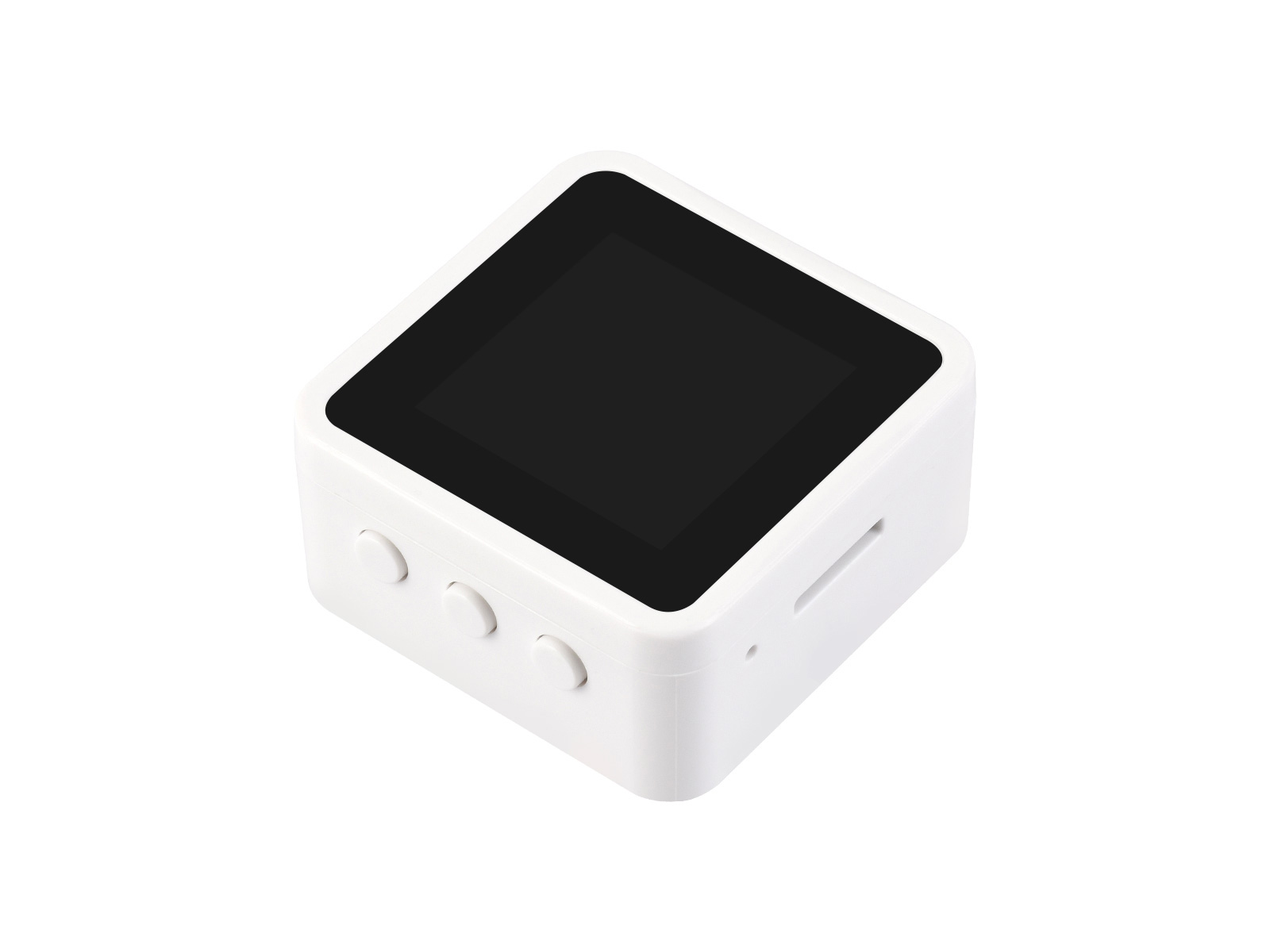 本产品由 Waveshare (微雪) 设计,采用小方盒开模塑料外壳,小巧美观且质感出众。板载 1.54 英寸液晶屏、六轴传感器、双麦克风阵列和