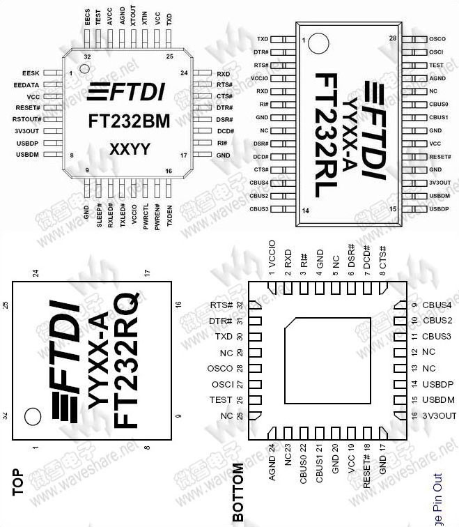 - FT232支持QFN32封装(FT232RQ),SSOP28封装(FT232RL)。