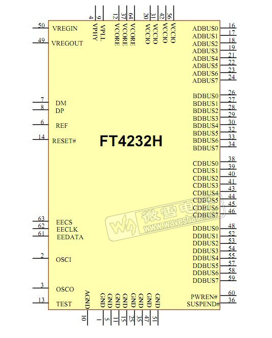 The FT4232H is a USB 2.0 Hi-Speed (480Mb/s) to UART IC. It has the capability of being configured in a variety of industry standard serial or parallel interfaces.