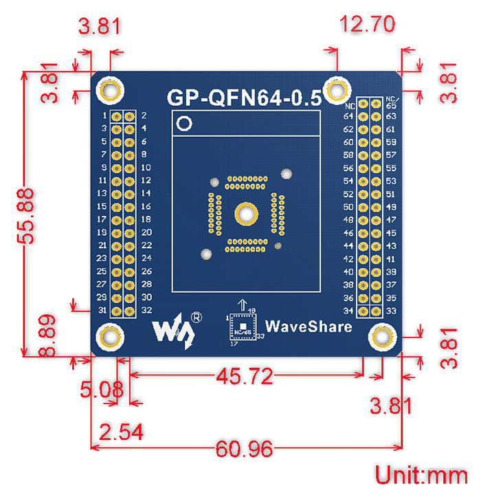 | QFN-64B-0.5-01 | 0.5 | 64 | 9 × 9 | 33 x 29 | 无 |