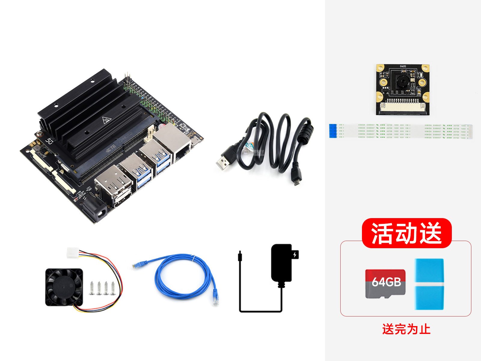 包含 Jetson Nano Module 核心板、Jetson Nano 扩展板、64GB micro SD 卡 (活动送,送完为止),读卡器 (活动送,送完为止),以及官方正品散热片
