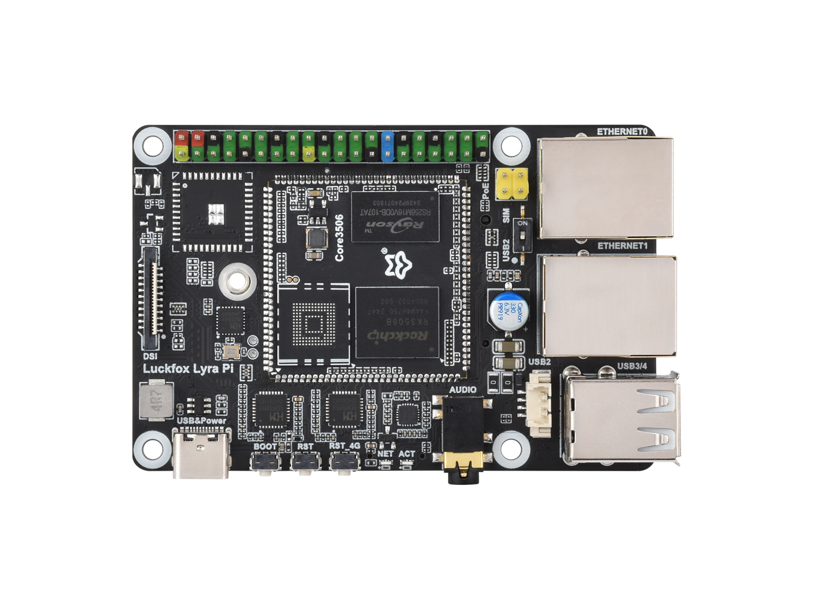 多核异构CPU,板载4G模块M.2接口,DDR3L,兼容树莓派DSI屏幕,Rockchip Matrix IO(共享复用PWM、UART、I2C、SPI和CAN等控制器信号),双10M/100M网口,3.5mm耳机/麦克风接口等 |