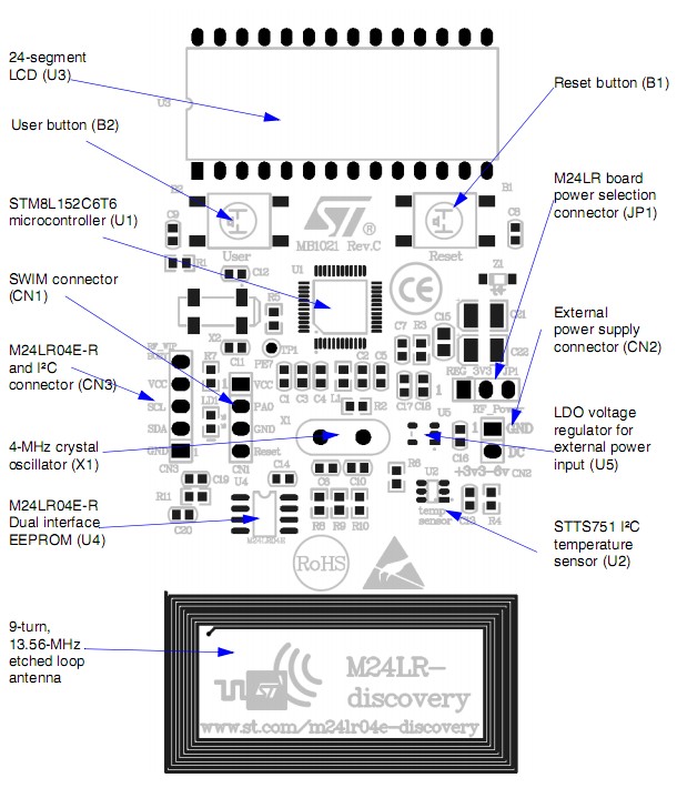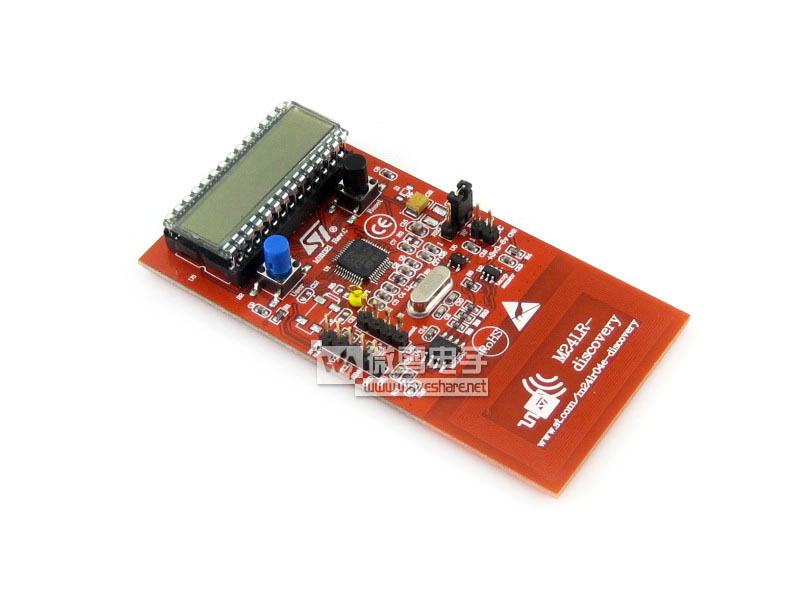 M24LR board 它是基于一个M24LR04E-R I²C - ISO/IEC15693双接口EEPROM,一个8位STM8L152C6T6超低功耗微控制器,还包括一个STTS751温度传感器,24段LCD,13.56