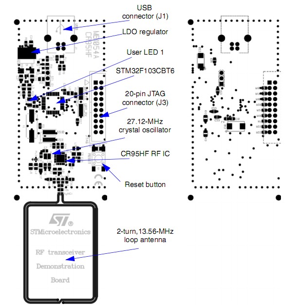 RF transceiver board 可充当RFID阅读器/记录器的射频收发器板。它是基于STM32F103CBT6微控制器上,并通过它的USB连接器被连接到一台计算机主机。还包括CR95HF