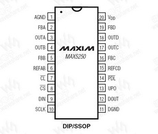 The +5V MAX5250 combines four low-power, voltage-output, 10-bit digital-to-analog converters (DACs) and four precision output amplifiers in a space-saving, 20-pin package.
