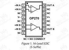 OP270 概述The OP270 is a high-performance monolithic dual operational amplifier with exceptionally low voltage noise, 5nV/(root)Hz at 1kHz Max, offering comparable performance to PMI's industry standard OP-27. The OP270 features an input offset voltage below 75µV and offset drift under 1µV/°C, guaranteed over the full military temperature range. Open-loop gain of the OP270 is over 1,500,000 into a 10k Ohm load insuring excellent gain accuracy and linearity, even in high-gain applications. Input bias current is under 20nA which reduces errors due to signal source resistance. The OP270's CMR of over 106dB and PSRR of less than 3.2µV/V significantly reduce errors due to ground noise and power supply fluctuations. Power consumption of the dual OP270 is one-third less than two OP-27s, a significant advantage for power concious applications. The OP270 is unity-gain stable with a gain-bandwidth product of 5MHz and a slew rate of 2.4V/µs. The OP270 offers excellent amplifier matching which is important for applications such as multiple gain blocks, low-noise instrumentation amplifiers, dual buffers, and low-noise active filters. The OP270 conforms to the industry standard 8-pin DIP pinout. It is pin compatible with the MC1458/1558, SE5532/A, RM4558, and HA5102 dual op amps and can be used to upgrade systems using these devices. |