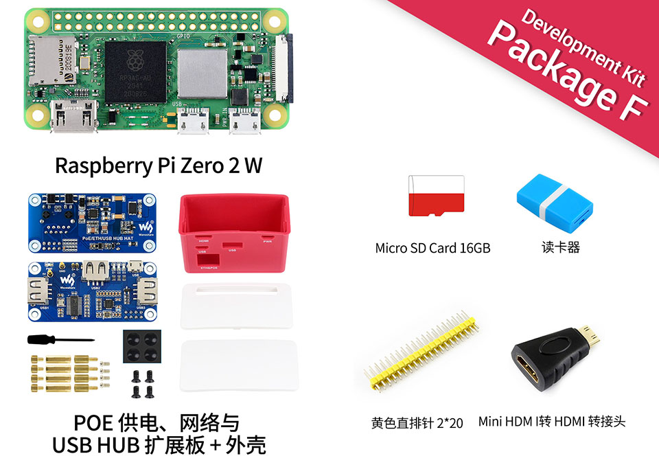 套餐 D 是一套 Raspberry Pi Zero 2 W 的 USB HUB 扩展套餐,可扩展为 4 路 USB 接口,扩展板采用弹簧顶针设计,可直接安装在 Zero 主板上,并且可以与 Zero 一同安装至红白外壳内组成一个迷你主机,美观防尘,心爱的 Zero 从此不易积灰。