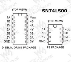 74LS00器件包含4路独立的2输入与非门。74LS00的逻辑功能表达式为:Y =