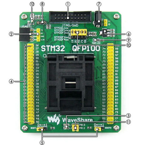 STM32-QFP100 /测试座板载JTAG/SWD标准编程接口,引脚定义如下所示: