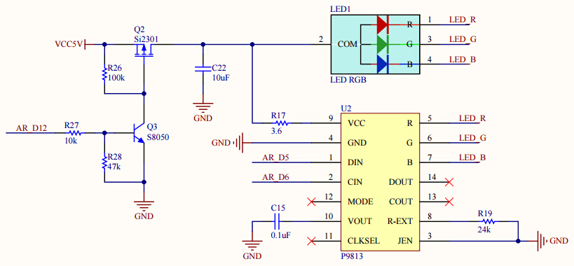| 学会了如何发声,下来就要开始学如何发光;虽然一开始在按键扫描那章有看到LED闪烁,但,,,,那真的太简单了。本章我们学习高大上的多彩LED。 原理大放送: 多彩LED又称为RGB灯,内置红(R)、绿(G)、蓝(B)三个灯珠,通过调节不同灯的亮度就可以混合出万千色彩。调节灯的亮度?没错就是你脑子现在想的那种方式!!! 其实就两种方式,电压或电流。这里我们采用一款性能优良的IC进行驱动,P9813,这是一款全彩点光源LED驱动芯片,采用CMOS工艺,提供三路恒流驱动及256级灰度调制输出。通信接口采用双线传输方式(DATA与CLK),内建再生(就是功率放大),可获得更远的传输距离,可用于驱动显示灯光变换、各式字符变换、彩色动漫图案............嗯,说好了全是放干货!具体细节可以去找度娘 原理图如下: 由于U2上电直接驱动RGB灯开始工作,而且颜色值随机。为了避免不使用的时候可以关闭它,所以采用MOS管Q2作为电源软开关,当AR_D12引脚输出高电平时,芯片才会上电工作。而Arduino上电默认引脚为低电平,这样可以保证上电后RGB灯不会突然点亮,吓坏小伙伴怎么办。 代码示例: #include "ChainableLED.h"