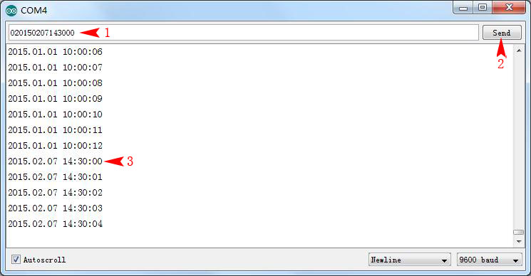 }下载程序后打开串口调试助手,这个程序的功能比较腻害!提供两个功能:通过串口显示当前的时间;可以通过串口设置新的时间!重点讲下设置时间方式: 1 号箭头位置是待设置的新时间: 020150207143000,第 1 个字符为 0,后面跟年(2015)、月 (02)、日 (07)、时(14)、分(30)、秒(00)共 15 个字符, 输入完毕后,点击 2 号箭头发送,会看到新的时间已经写入。 注意:时间格式为 24 小时制;数据长度必须为 15 个字符,例如 2 月需要写成 02,其他数据段写法类似。 附件: |